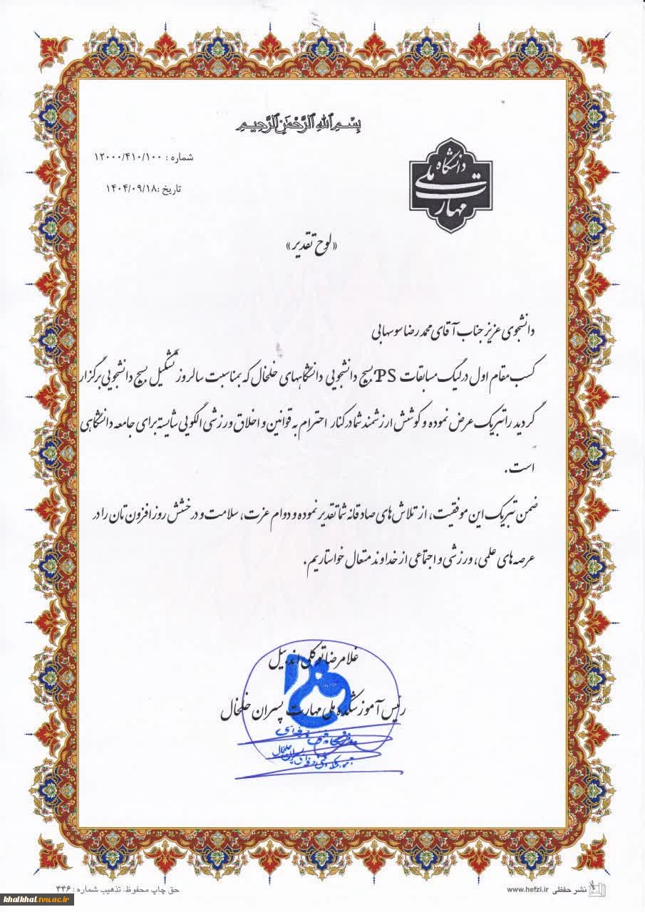 امتیاز دهید : تجلیل از دانشجوی بسیجی آموزشکده پسران خلخال آقای محمدرضا سوسهابی به پاس حضور و کسب مقام اول لیگ مسابقات ps بین دانشجویان دانشگاههای خلخال آذر ماه ۱۴۰۴ روابط عمومی آموزشکده پسران خلخال 3 شنبه 29 آذر 1404 ساعت 14:19