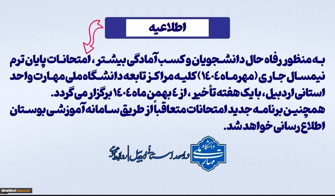 امتیاز دهید : اطلاعیه فوری-شروع امتحانات پایان ترم جاری از ۴ بهمن ماه ۱۴۰۴ برنامه جدید امتحانات متعاقباً 2 چهارشنبه 24 دی 1404 ساعت 8:39