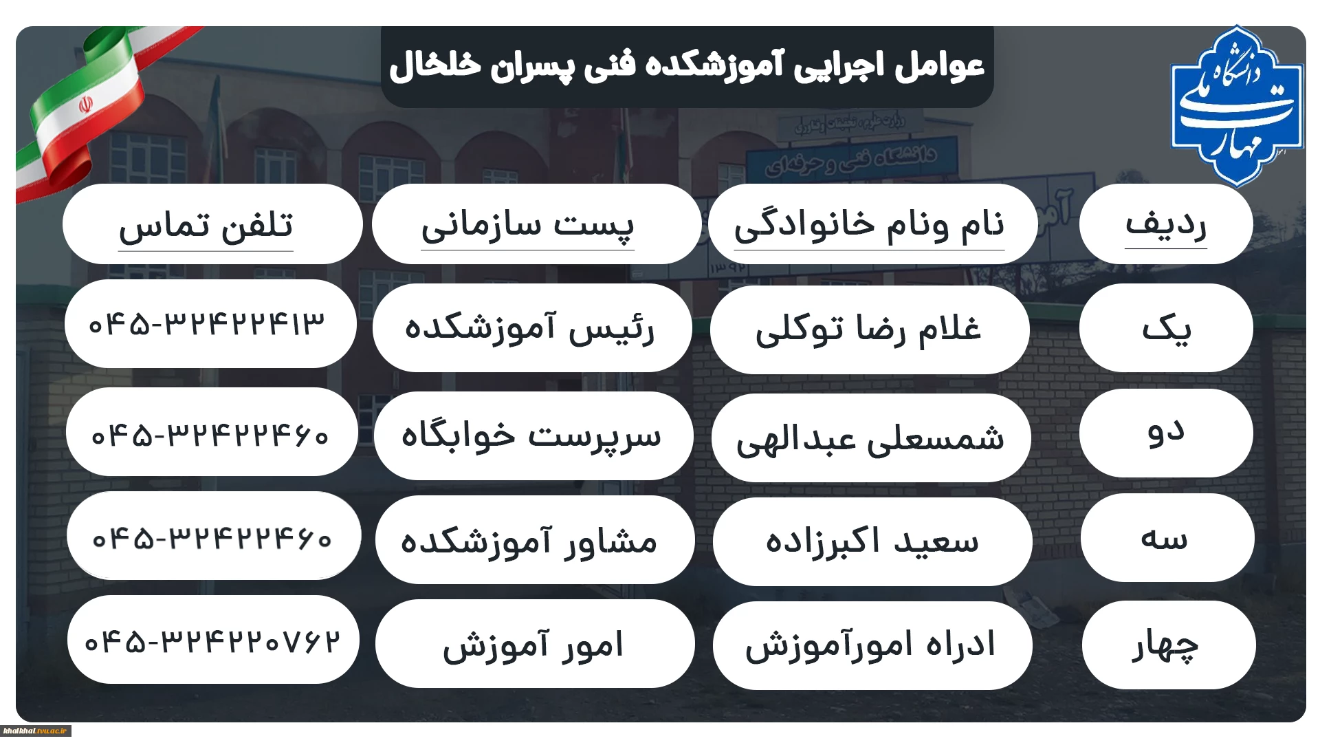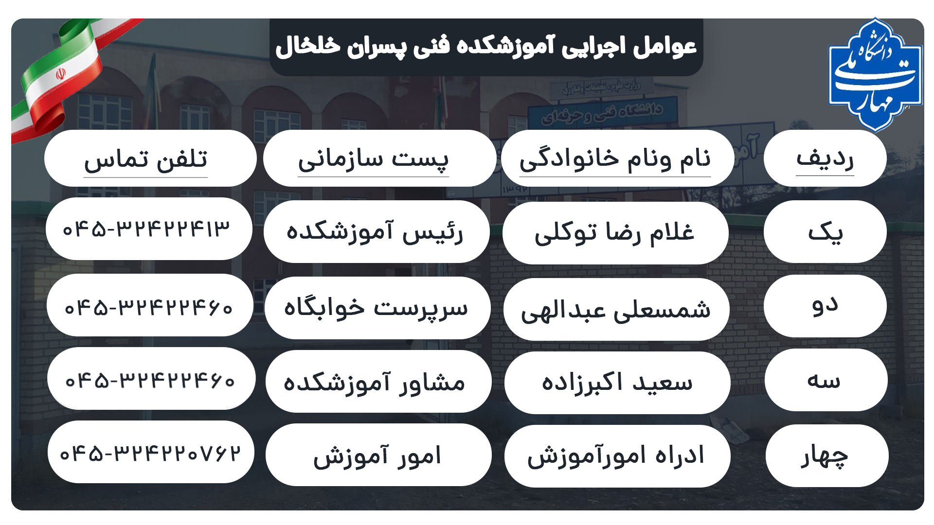 ارتباط با عوامل اجرایی آموزشکده ملی مهارت پسران خلخال (ابن سینا)